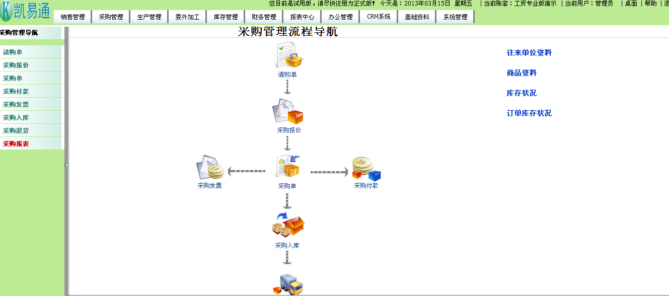 涵盖功能:请购单、采购报价、采购单、采购付款、采购发票、采购入库、采购退货、采购报表