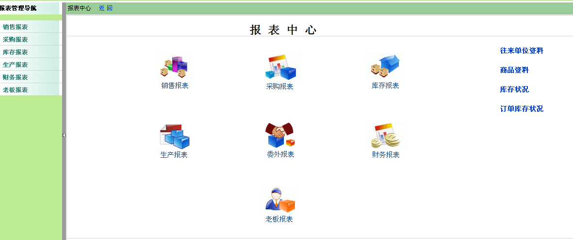 涵盖功能:销售报表、采购报表、库存报表、财务报表、老板报表