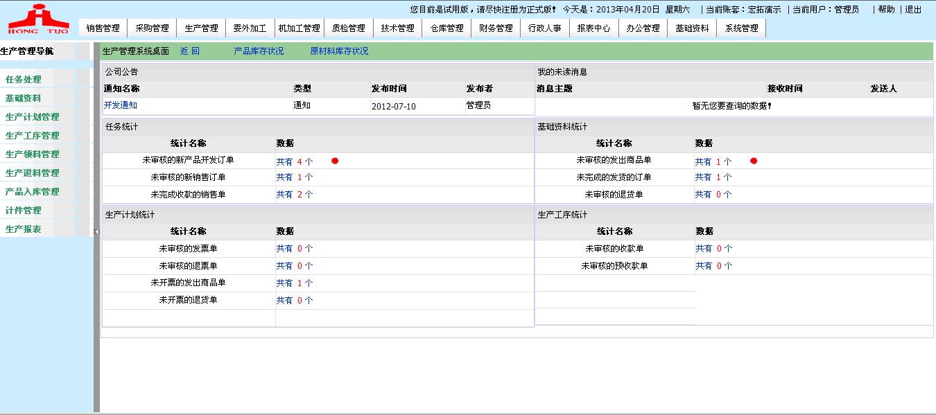 销售管理、采购管理、生产管理、委外加工、机加工管理、质检管理、技术管理、仓库管理、财务管理、行政人事、报表中心、办公管理、基础资料、系统管理